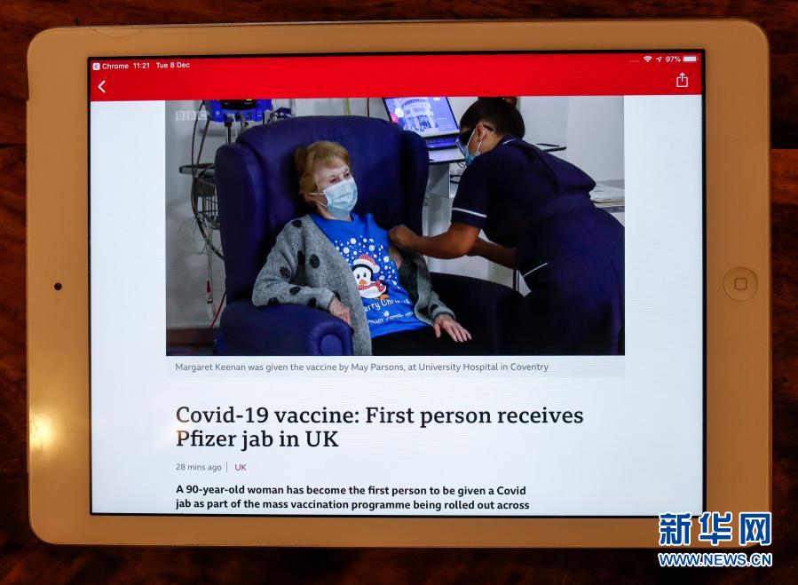 12月8日在英國(guó)倫敦拍攝的播放新聞的電腦屏幕顯示,醫(yī)護(hù)人員為90歲女子瑪格麗特·基南接種疫苗?,敻覃愄亍せ鲜窃搰?guó)首位接種新冠疫苗的人。