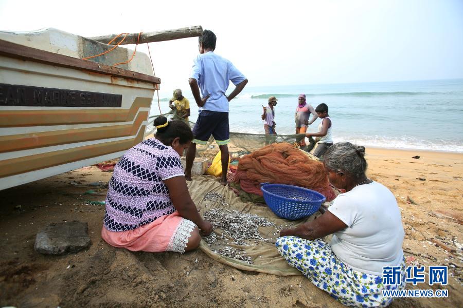 12月12日,在斯里蘭卡首都科倫坡附近的莫勒?qǐng)D沃,漁民在海邊分揀捕獲的魚(yú)。