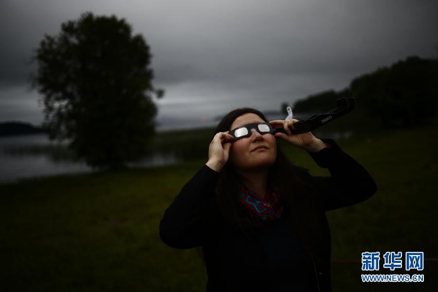 12月14日,一名女子在智利南部河大區(qū)的潘吉普伊觀賞日全食。新華社發(fā)
