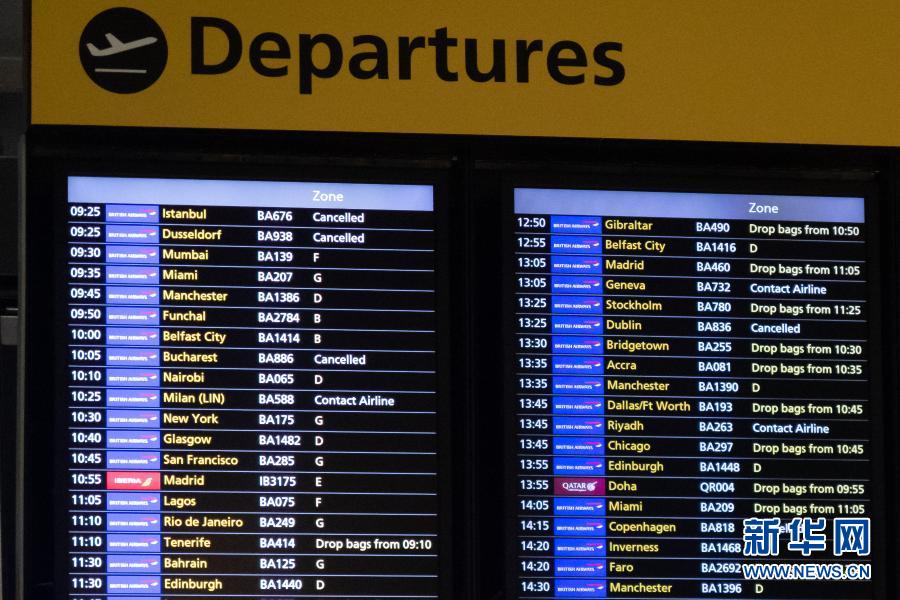 12月21日,英國(guó)倫敦希思羅機(jī)場(chǎng)第五航站樓內(nèi)顯示多趟航班被取消。新華社發(fā)(蒂姆·愛(ài)爾蘭攝)