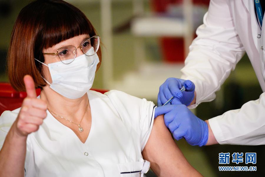 12月27日,在波蘭首都華沙一家醫(yī)院,一名護士接種新冠疫苗。