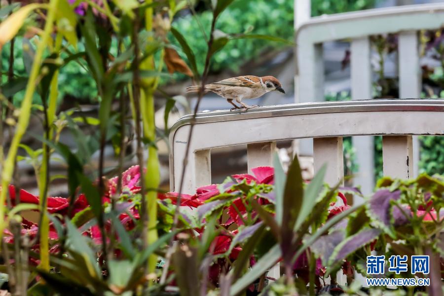 3月18日,在位于馬尼拉的菲律賓大學附屬菲律賓總醫(yī)院,一只麻雀站在“低語的花床”藝術裝置上。