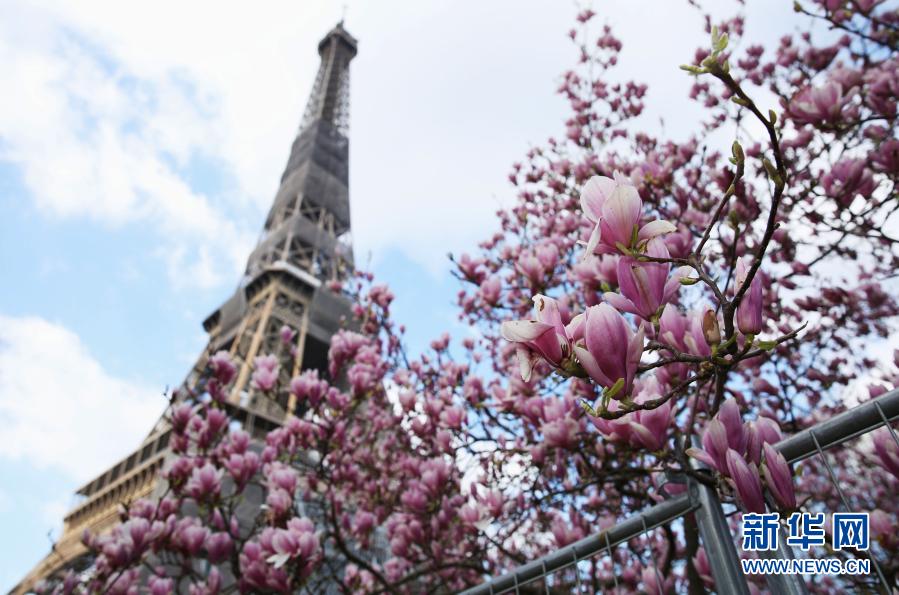 這是3月19日在法國巴黎埃菲爾鐵塔腳下的戰(zhàn)神廣場拍攝的盛放的玉蘭花。新華社記者高靜攝
