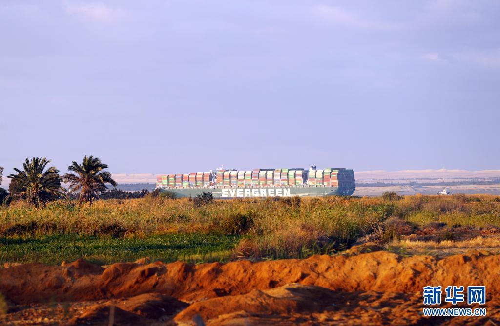 這是3月29日拍攝的移動至埃及蘇伊士運(yùn)河正常航道上的重型貨輪。新華社記者 隋先凱 攝