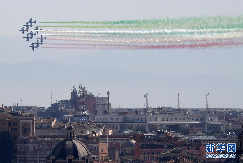 當日,意大利“三色箭”飛行表演隊在意大利首都羅馬舉行飛行表演,慶祝意大利空軍建立98周年。