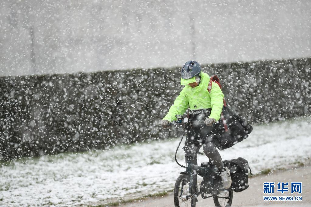 4月6日,一名市民在比利時布魯塞爾五十周年紀(jì)念公園冒雪騎車。