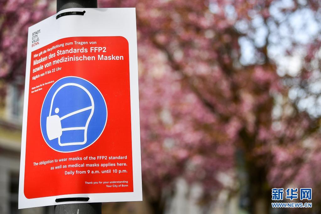 4月13日,德國波恩老城區(qū)的櫻花樹下張貼著提示游人佩戴醫(yī)用口罩的標識。