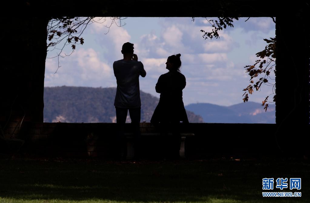 5月3日,兩位游客在澳大利亞悉尼西部藍(lán)山地區(qū)的一個觀景臺駐足。