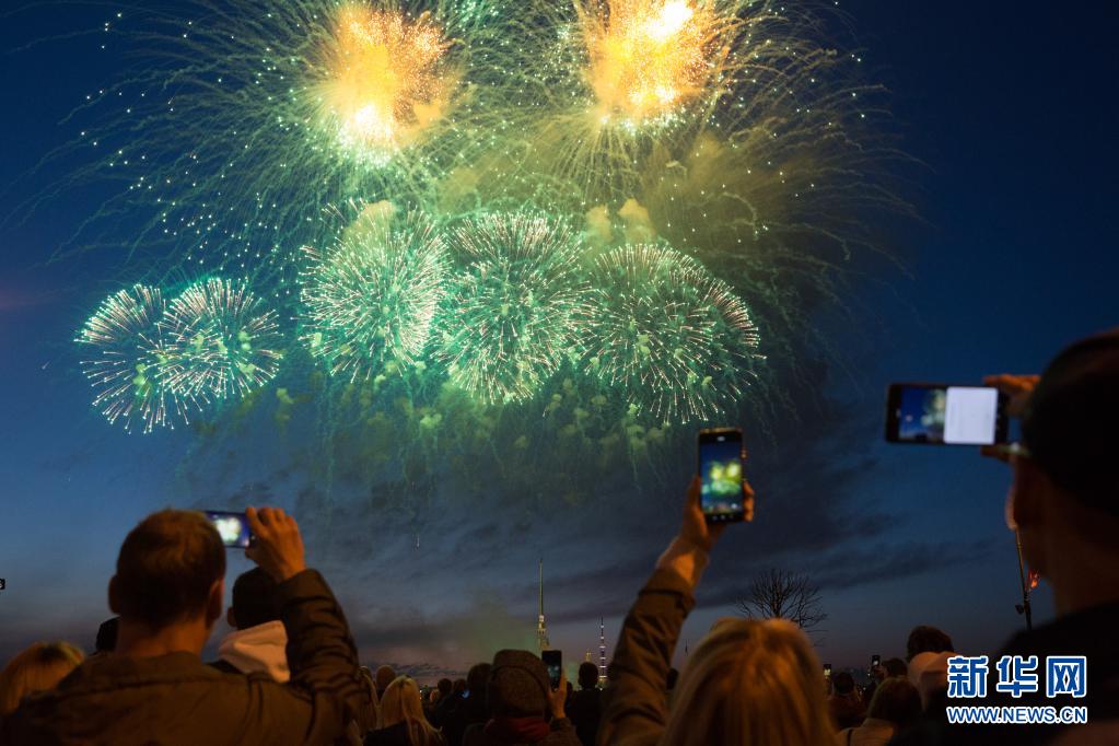 5月9日,人們在俄羅斯圣彼得堡觀看煙花。