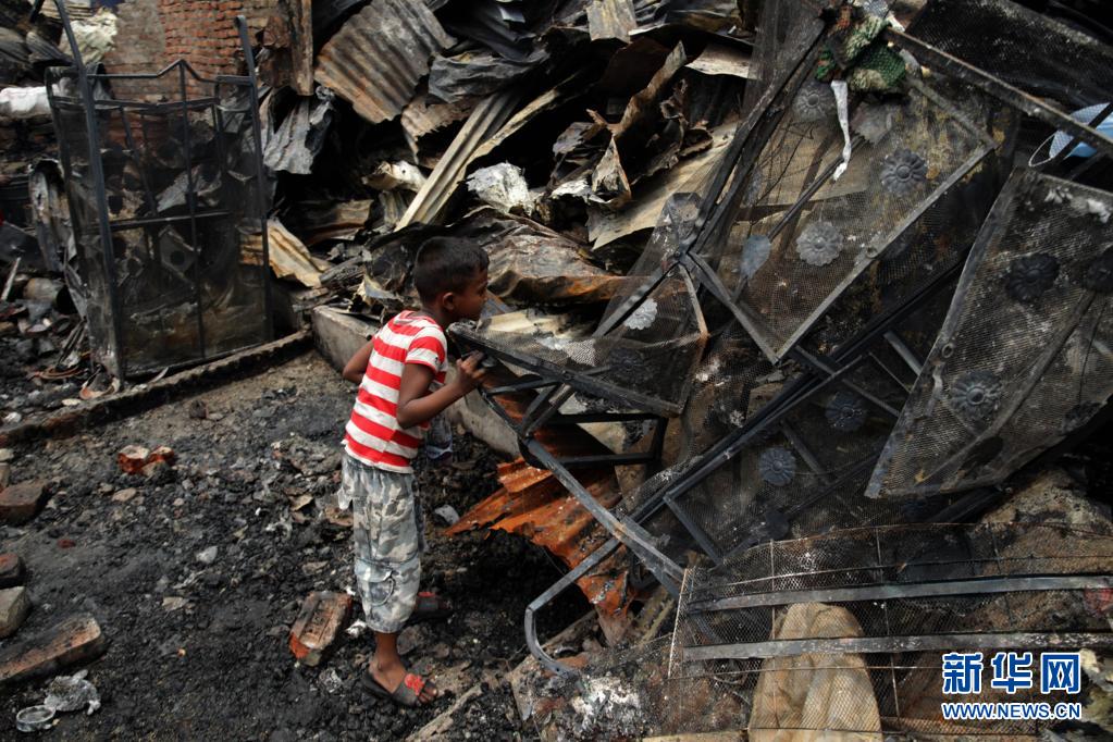 6月7日,一名兒童在孟加拉國首都達(dá)卡發(fā)生火災(zāi)的貧民窟廢墟中尋找個(gè)人物品。