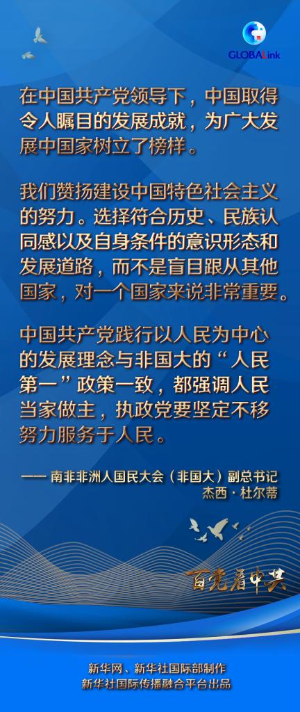 杜爾蒂說,2021年是中國共產(chǎn)黨成立一百周年,中國共產(chǎn)黨創(chuàng)造了一個(gè)又一個(gè)輝煌。“我謹(jǐn)代表非國大全國執(zhí)行委員會(huì)祝賀中國共產(chǎn)黨走過成功的百年。預(yù)祝中國共產(chǎn)黨在下一個(gè)百年中取得更大成就!”