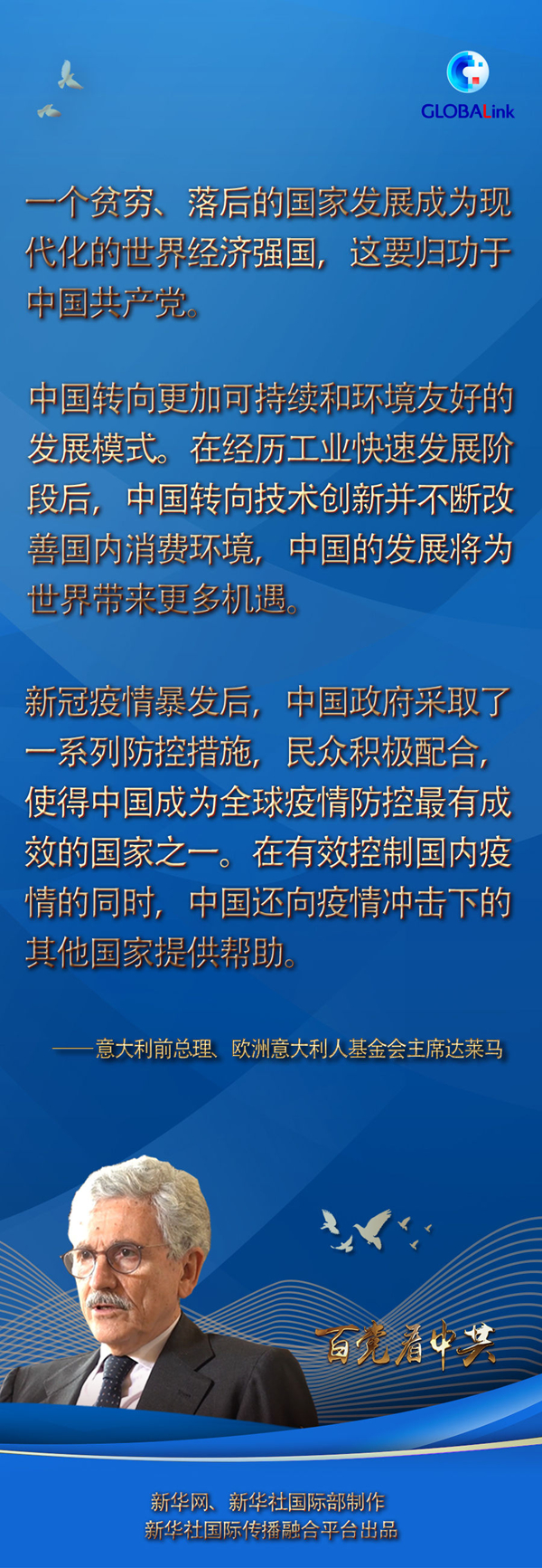 達(dá)萊馬先后擔(dān)任過(guò)意大利總理和外長(zhǎng)等職,從20世紀(jì)70年代起多次訪問(wèn)中國(guó),見(jiàn)證了幾十年來(lái)中國(guó)的發(fā)展。
