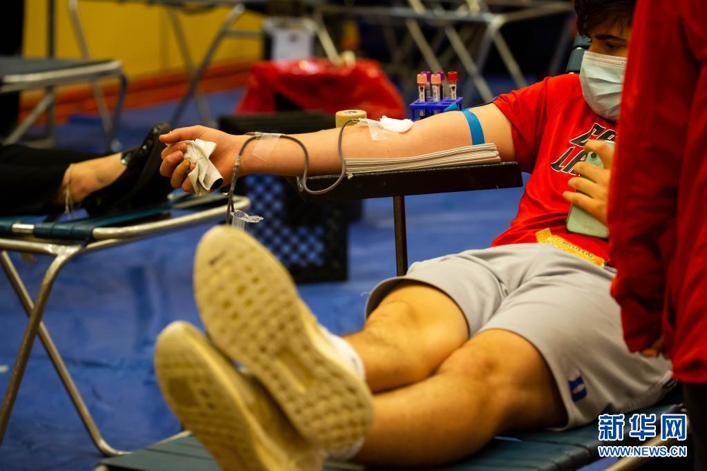 6月14日,在美國(guó)紐約州長(zhǎng)島地區(qū)的尤寧代爾,獻(xiàn)血志愿者在美國(guó)紐約血液中心舉行的獻(xiàn)血活動(dòng)上獻(xiàn)血。