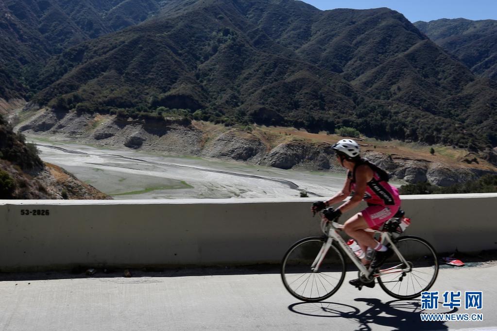 6月24日,一名女子騎車經(jīng)過美國加利福尼亞州洛杉磯縣阿祖薩市附近的圣加布里埃爾水庫。